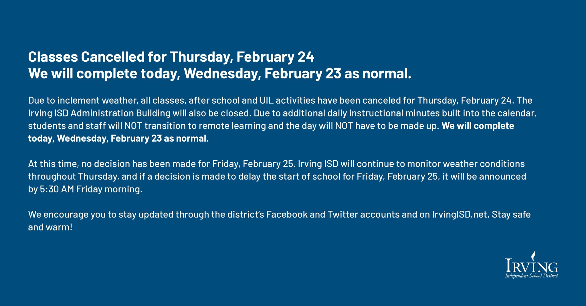 Irving ISD on X: “‼️New Winter Weather Update‼️ https://t.co